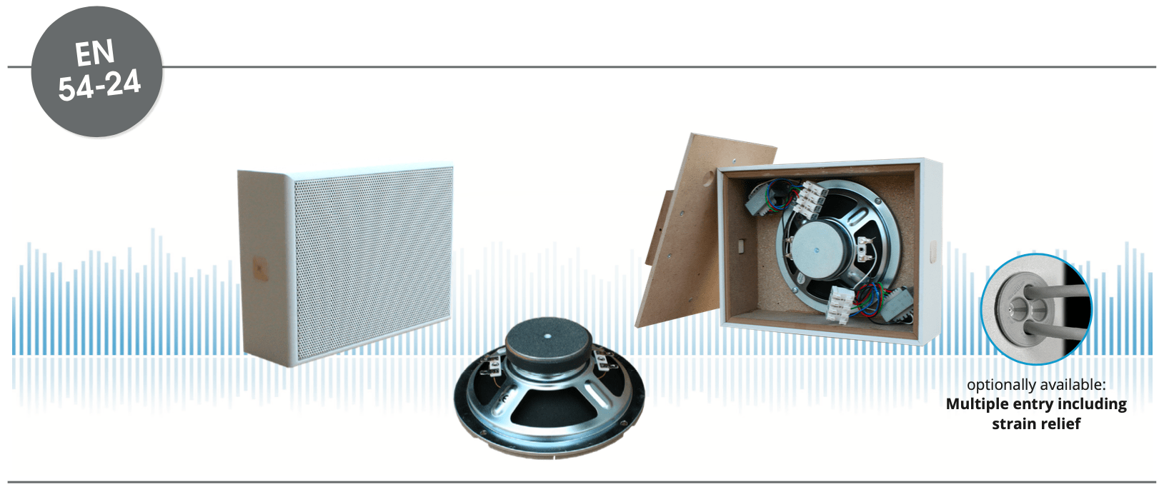 Description Description EN 54-24 On-Wall / Ceiling-Speaker in MDF with 2x 6 Watt Power and AB-Dual-Cone-Technique Power-Consumption: 2x 100V-6-3-1,5W Dimension: 255 x 195 x 85 mm Material: MDF / Metal-Grill Color: white