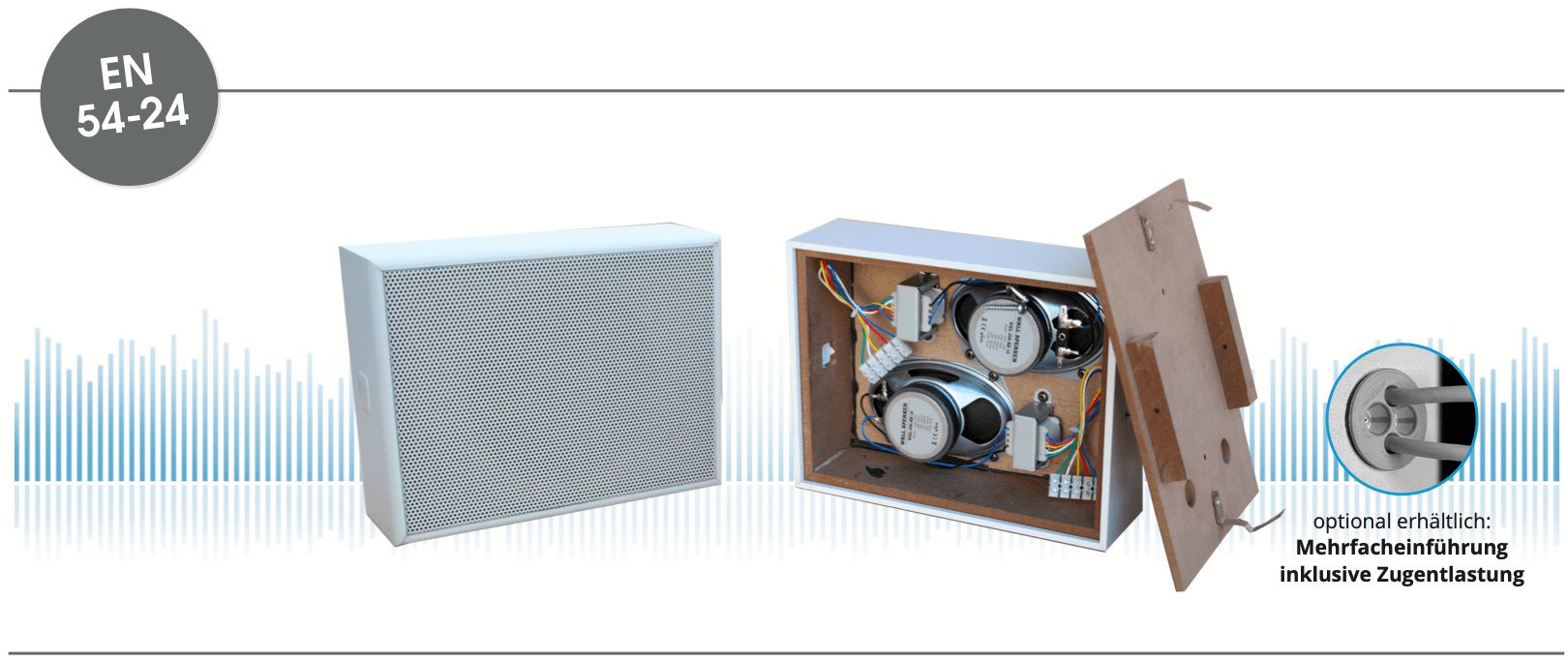Beschreibung Beschreibung EN 54-24 Wand / Deckenaufbau-Lautsprecher in MDF mit 2x 10 Watt Leistung und AB – Technik Leistungsaufnahme : 2x 100V-10-6-3-1,5W Maße: 255 x 195 x 85mm Material: MDF/Metall-Gitter Farbe: weiß