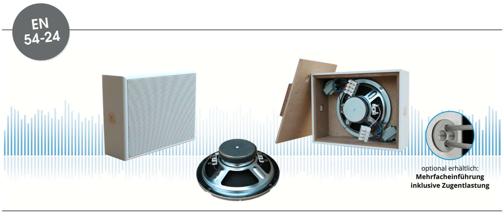 Beschreibung Beschreibung EN 54-24 Wand / Deckenaufbau-Lautsprecher in MDF mit 2x 6 Watt Leistung und AB-Dual-Cone-Technik Leistungsaufnahme : 2x 100V-6-3-1,5W Maße: 255 x 195 x 85mm Material: MDF/Metall-Gitter Farbe: weiß