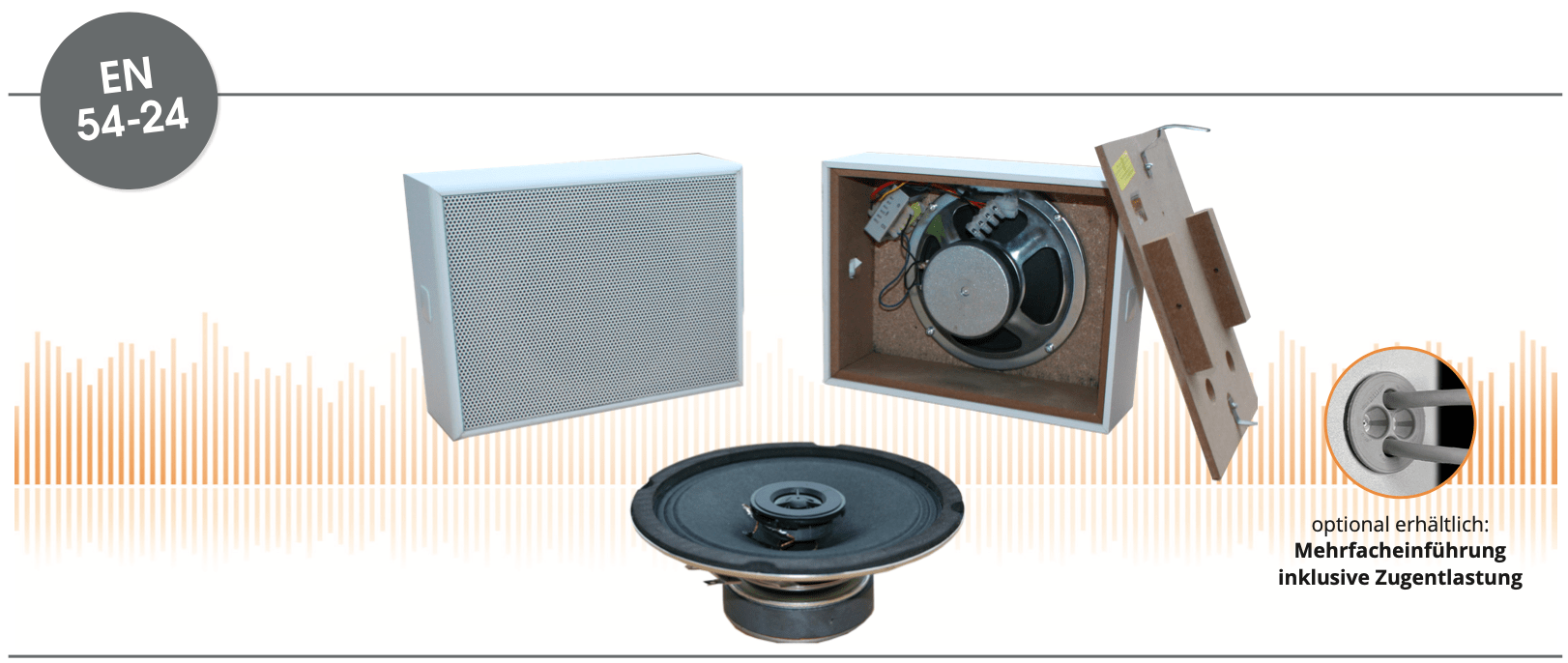 Beschreibung Beschreibung EN 54-24 Wand / Deckenaufbau-Lautsprecher in MDF mit 30 Watt Leistung und 2-Wege-Technik Leistungsaufnahme : 100V-30-20-10-6-3W / 2-Wege Maße: 255 x 195 x 85mm Material: MDF / Metall-Gitter Farbe: weiß